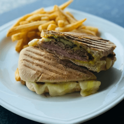 Grilled ham, carnita pork, Swiss cheese, sliced pickle, and yellow mustard. (Ask what items can be made gluten-friendly.)
