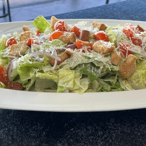 Gluten friendly. Crisp romaine lettuce, croutons, diced red onion, grape tomatoes, and capers tossed in a creamy Caesar dressing. Topped with Parmesan cheese