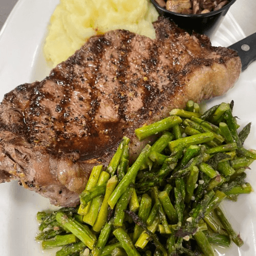 Center cut, 12 oz choice striploin, topped with a sauté of onions, bell peppers, and mushrooms served with garlic mashed potatoes and vegetable