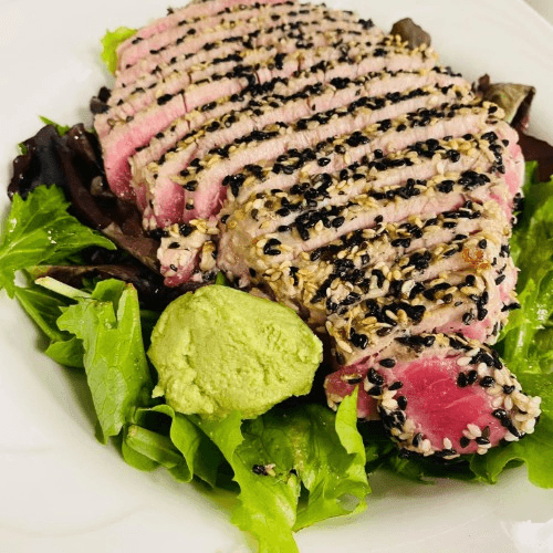 Gluten friendly. Fresh ahi tuna coated with sesame seeds, seared (rare), and placed over greens tossed with extra virgin olive oil and served with house wasabi sauce