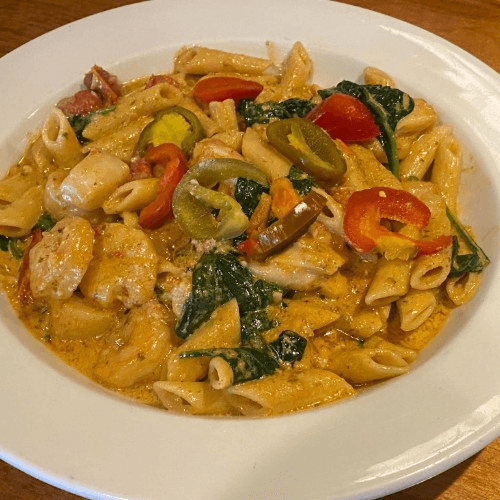 GS Steamers signature dish. Sautéed chicken breast, baby spinach, and roasted tomato tossed with cajun cream sauce and penne pasta. Topped with cherry pepper rings