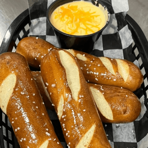 Warm pretzel rods served with a spicy beer queso dipping sauce
