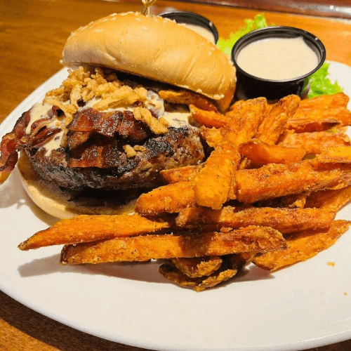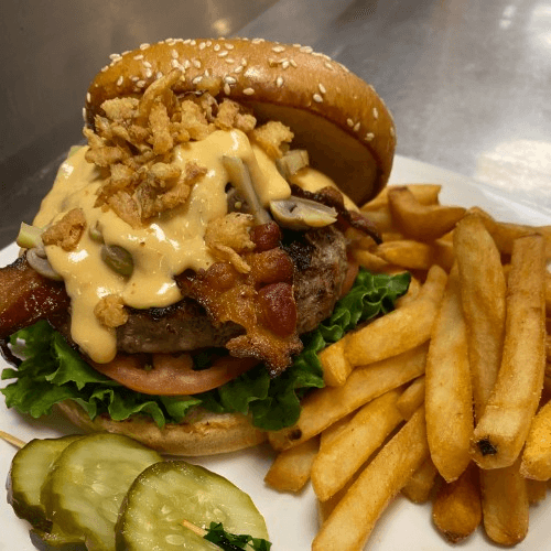 Blended steak burger, hickory bacon, sauteed mushrooms, crispy onions, steak house aioli, beer cheese sauce, toasted brioche bun served with lettuce, tomato, onion, and pickles