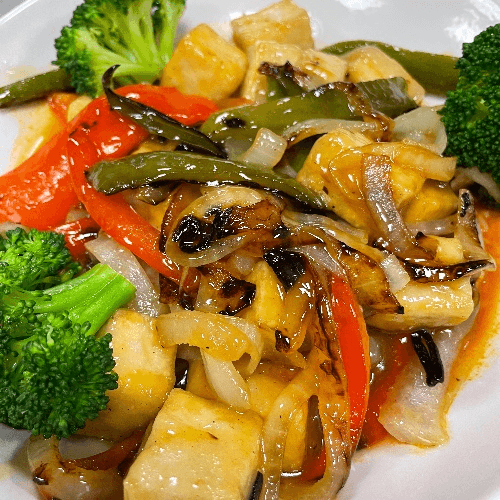 Vegan. Gluten friendly. Crispy tofu, bell peppers, red onion, sweet & sour sauce, served over basmati rice with broccoli